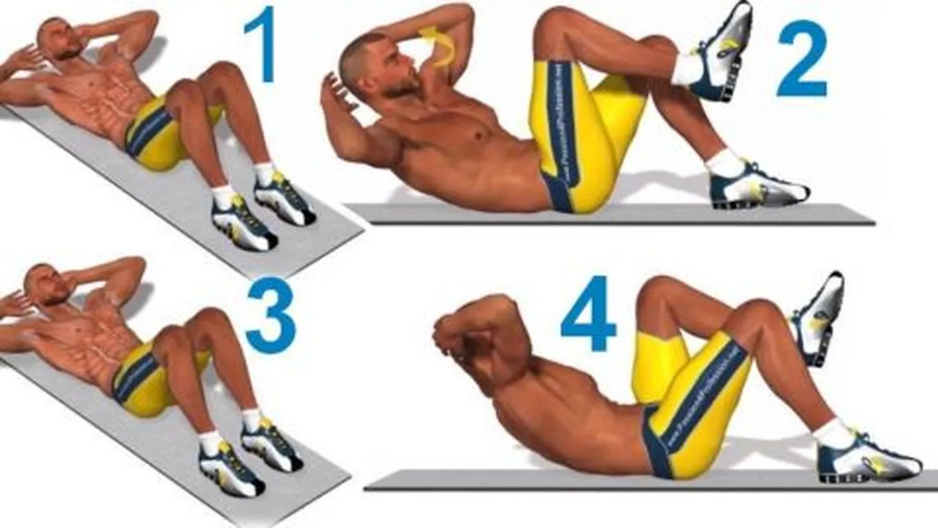 التمدّد على الظهر، وثني الركبة، مع وضع القدمين بشكل مسطّح على الأرض مع فتحمها بعرض الورك، ثمّ وضع اليد على منطقة الفخذ، بشكل متقاطع مع جهة الصدر أو خلف الأذن، والهبوط ببطء نحو الركبة، حتى يصبح ارتفاع الكتف نحو ثلاث بوصات من الأرض، مع الاحتفاظ على هذه الوضعية لخمس ثواني، ثمّ خفض الجسم ببطء، مع تكرار هذا التمرين اثنتي عشرة مرة خلال اليوم، مع مراعاة عدم ثني الرقبة باتجاه الصدر عند الوقوف، وعدم رفع الرأس بقوة عن الأرض.
