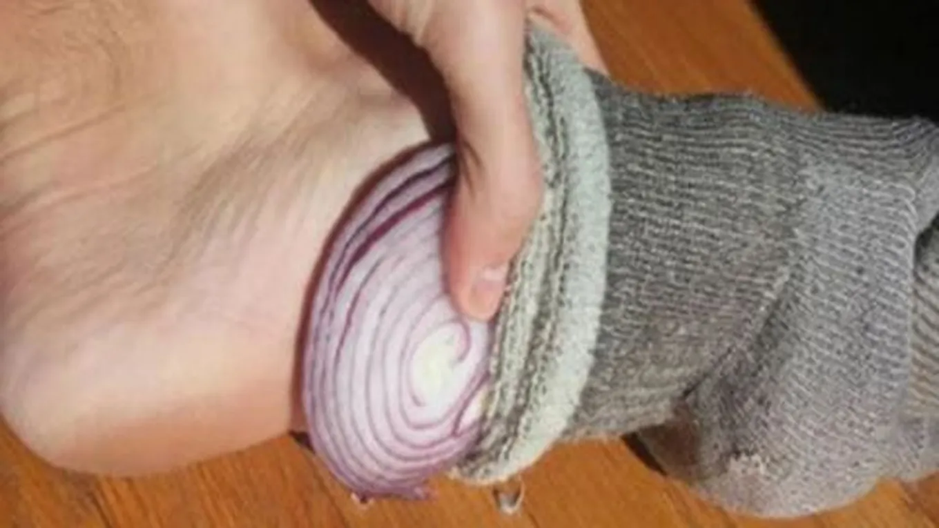 يتم ذلك من خلال وضع شريحة من البصل على الجزء السفلي من القدم وتثبيتها باستخدام قطعة من البلاستيك الخفيف أو النايلون قبل ارتداء الجوارب فوقها ليلاً قبل الخلود إلى النوم مع تركها هكذا حتى صباح اليوم التالي.