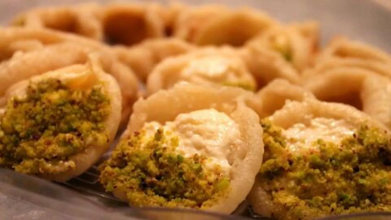 - وضع كمية من القشطة في وسط القطايف وتوزيع الشيرة والقليل من الفستق الحلبي وعدة ورقات مربى الزهر وتقديمها بالفور.