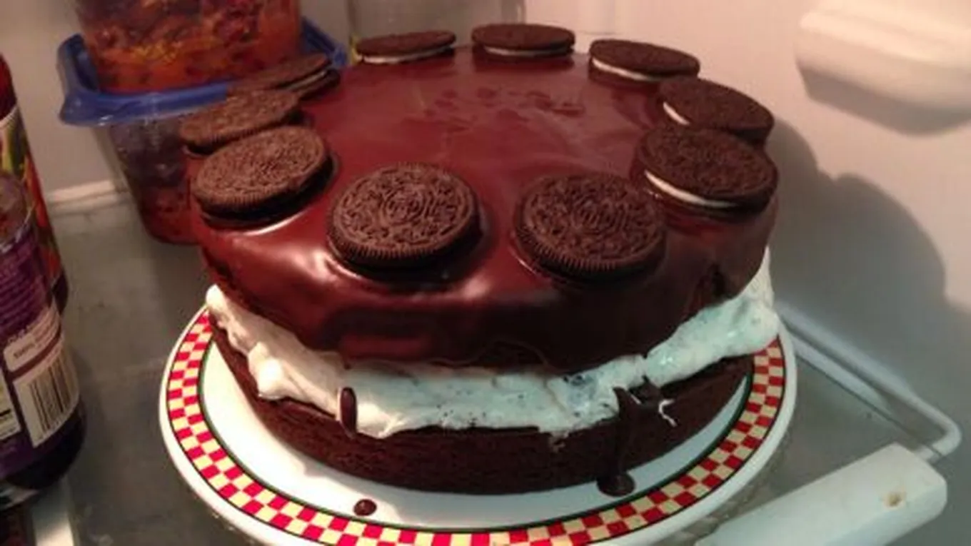 - نقل الكيك إلى طبق التجميع، ورش فتات بسكويت الأوريو فوقه.