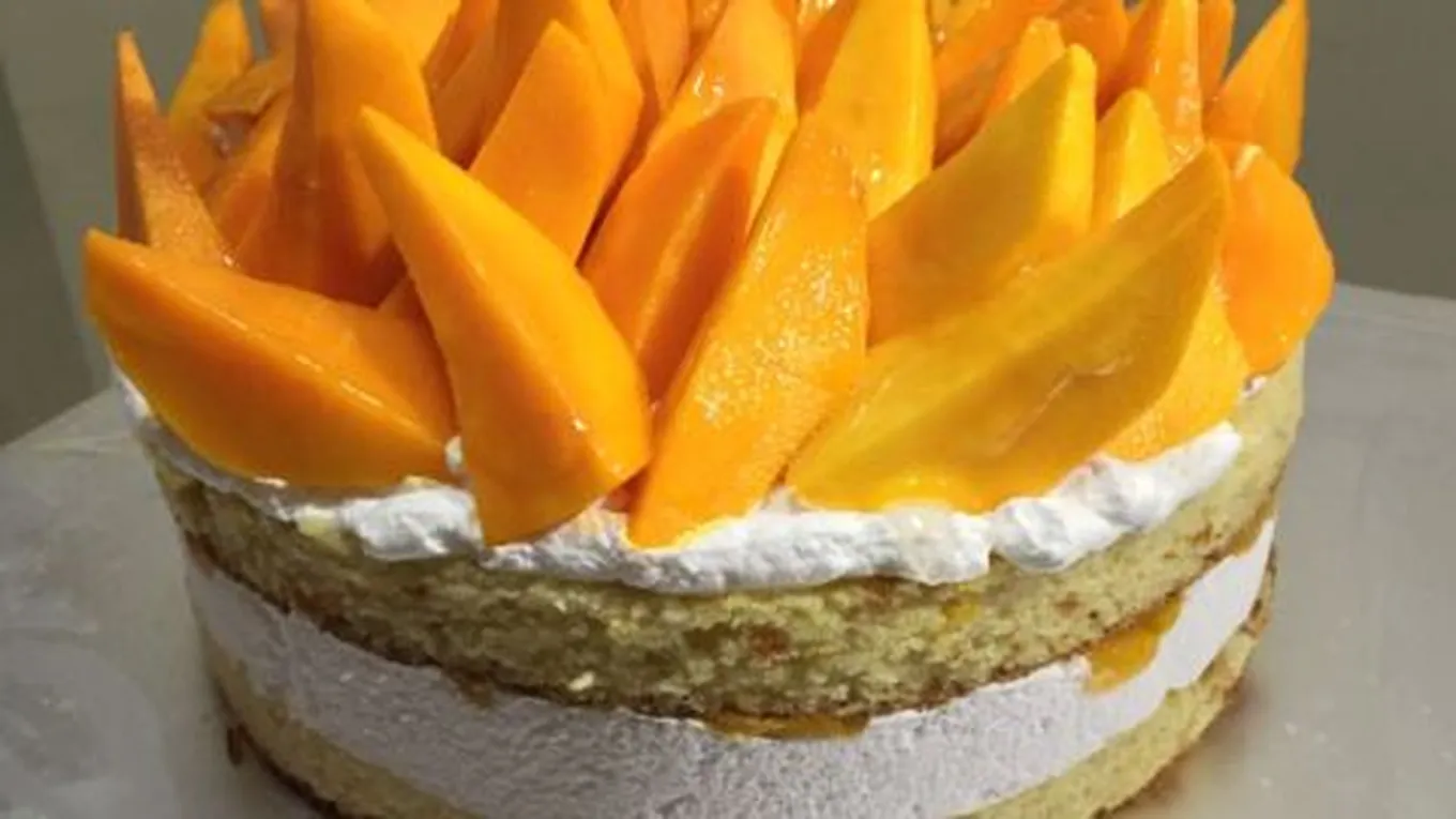 - تزيين الكيك بالمانجو والكريمة المخفوقة.