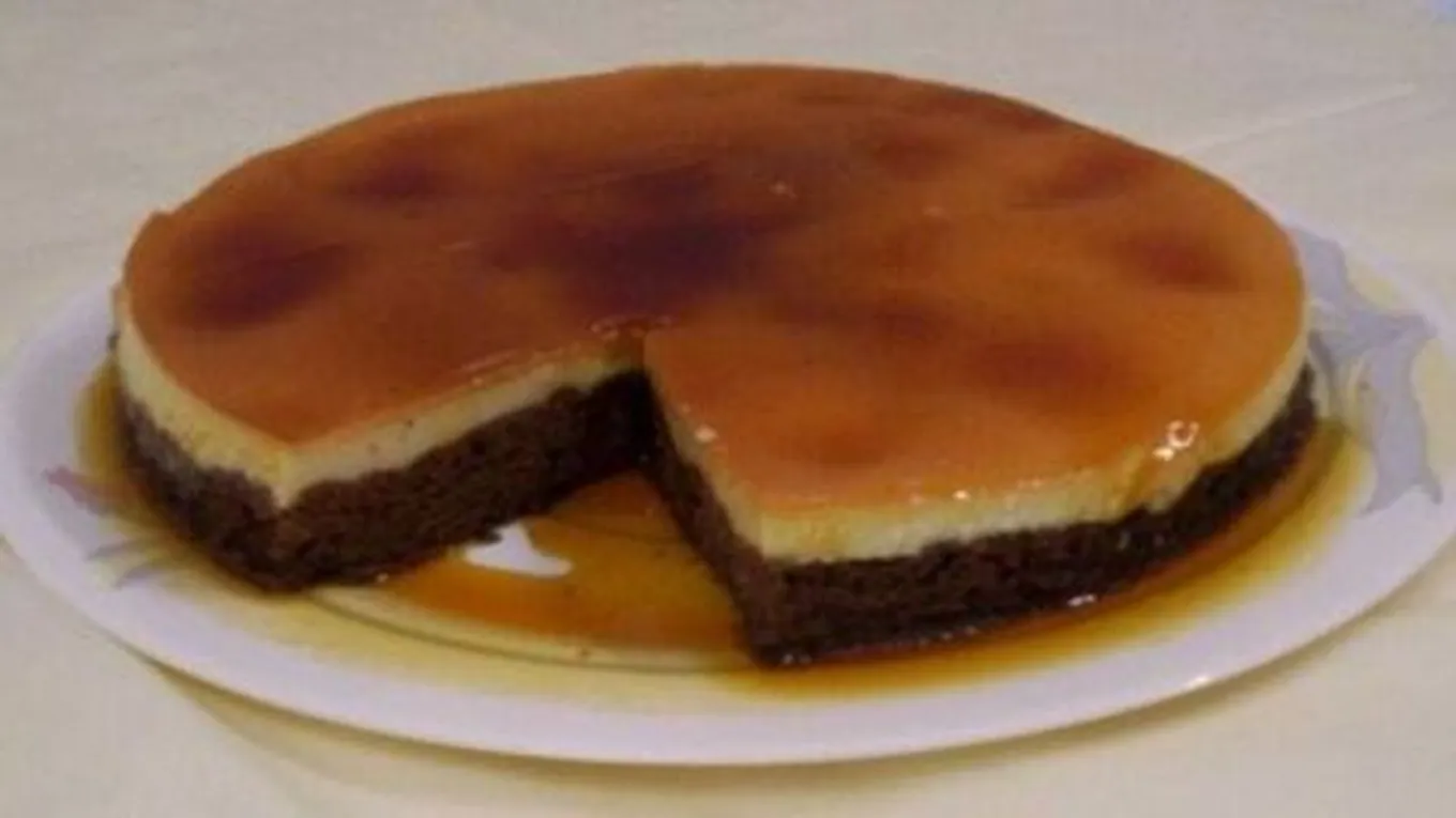 - تُقلب الصينية في طبق التقديم، لنلاحظ أنّ الكيك هو الطبقة الأولى، تليها طبقة الكريمة، ثمّ الكراميل.