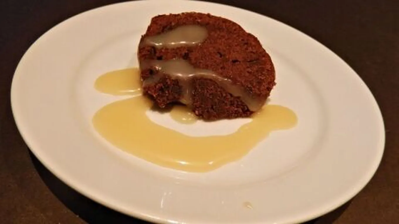 - قلب الكيك على طبق تقديم له حواف لمنع تساقط الكراميل.