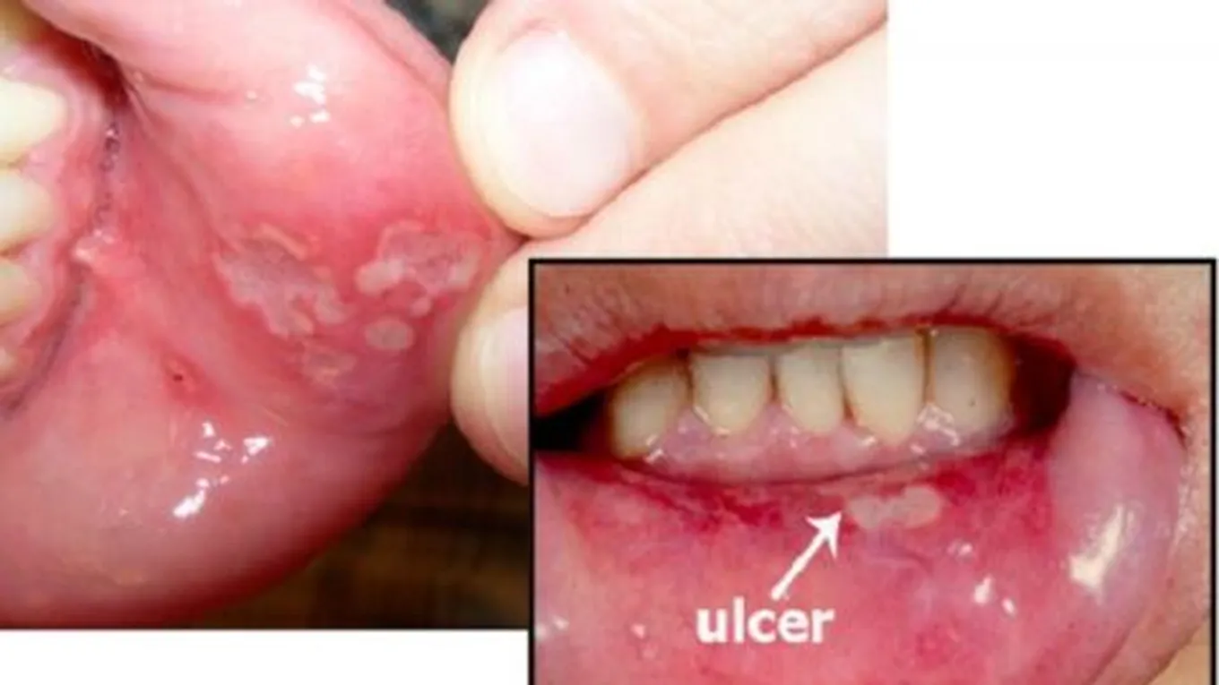 - التقرحات القلاعيّة: (بالإنجليزية: Canker sores) وهي بثور صغيرة سطحية تظهر على الأغشية المبطنة للفم أو اللثة، ومن الممكن أن تسبّب هذه التقرحات الشعور بالألم، وصعوبة في الأكل والتحدث، وفي الحقيقة تختفي هذه التقرحات بشكل تلقائيّ خلال أسبوع إلى أسبوعين.[4]