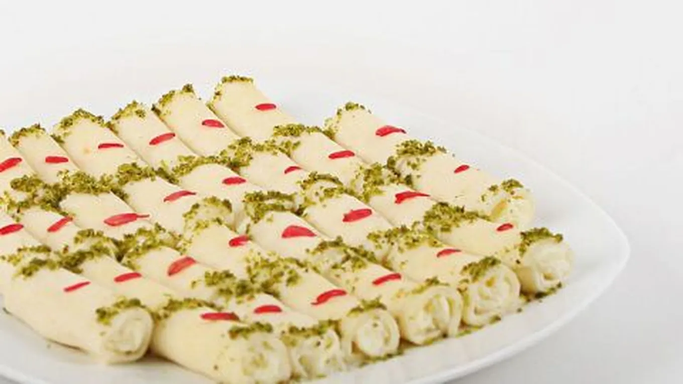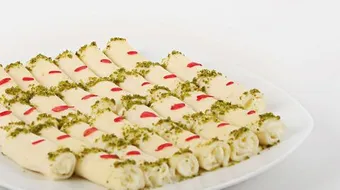 - وضع لفائف حلاوة الجبن في طبق للتقديم ثمَّ تزيينه بالفستق الحلبي.