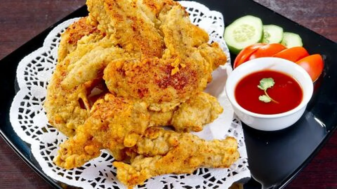 - وضع قطع الدجاج في الزيت الساخن حتى تتحمر، ثم تقليب القطع وتركها على نارٍ متوسطة لمدة ثماني دقائق، إلى تصبح ذهبية اللون.