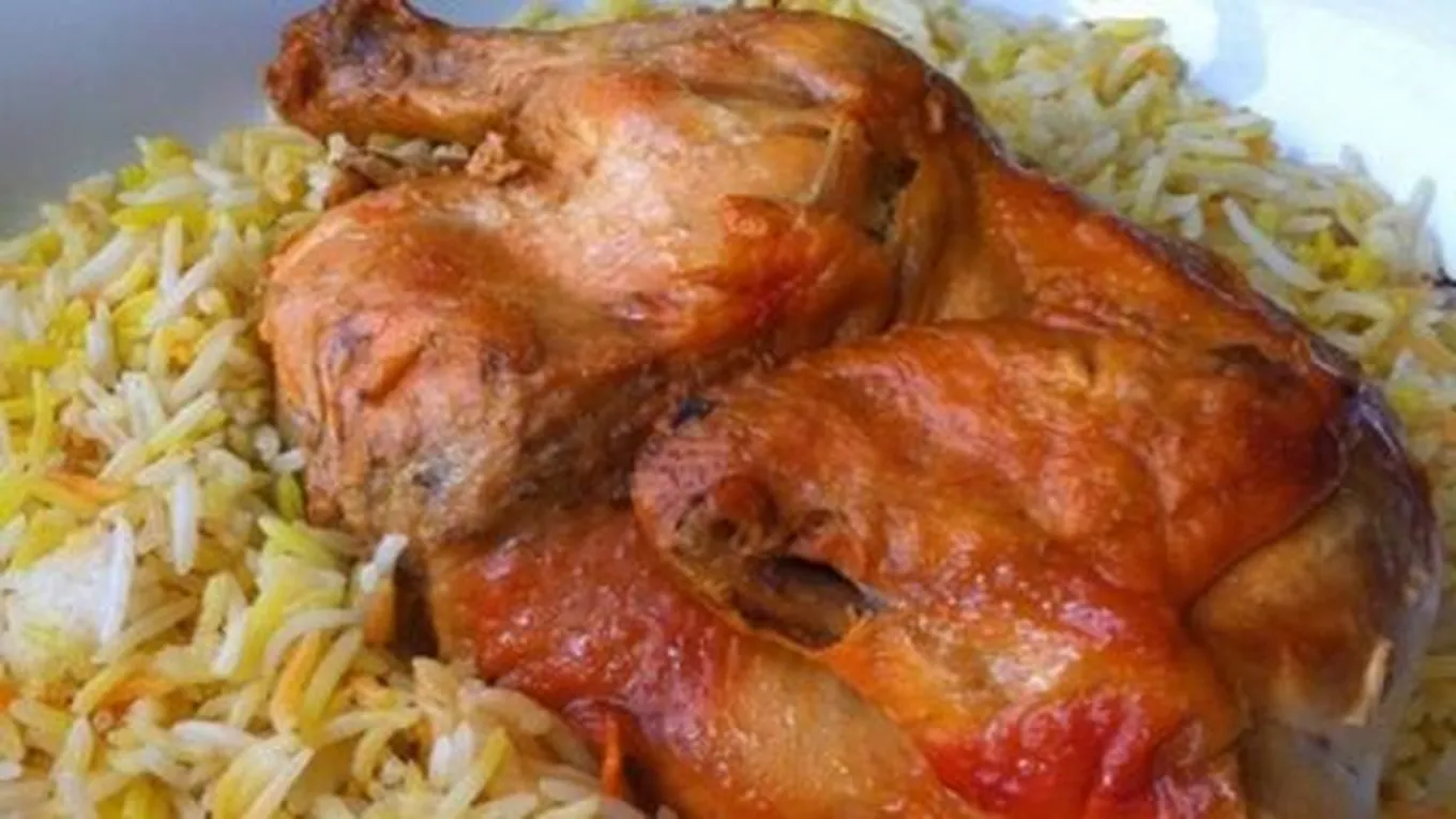 - وضع الأرز في طبق تقديم، وصف الدجاج فوقه.