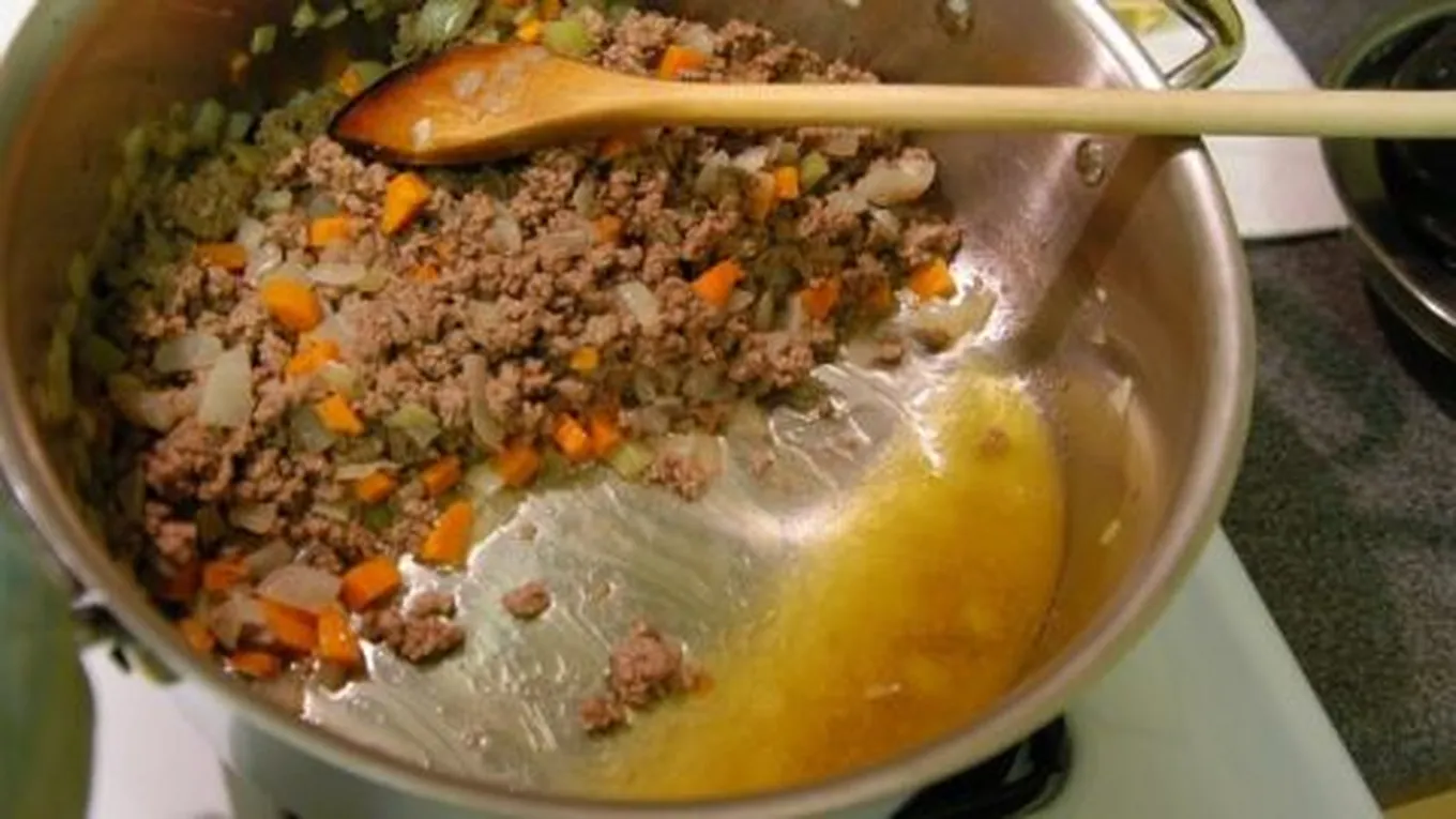- إضافة اللحم المفروم إلى البصل، وتحريك المكوّنات جيّداً حتى يتغير لون اللحم ويتحمّر.