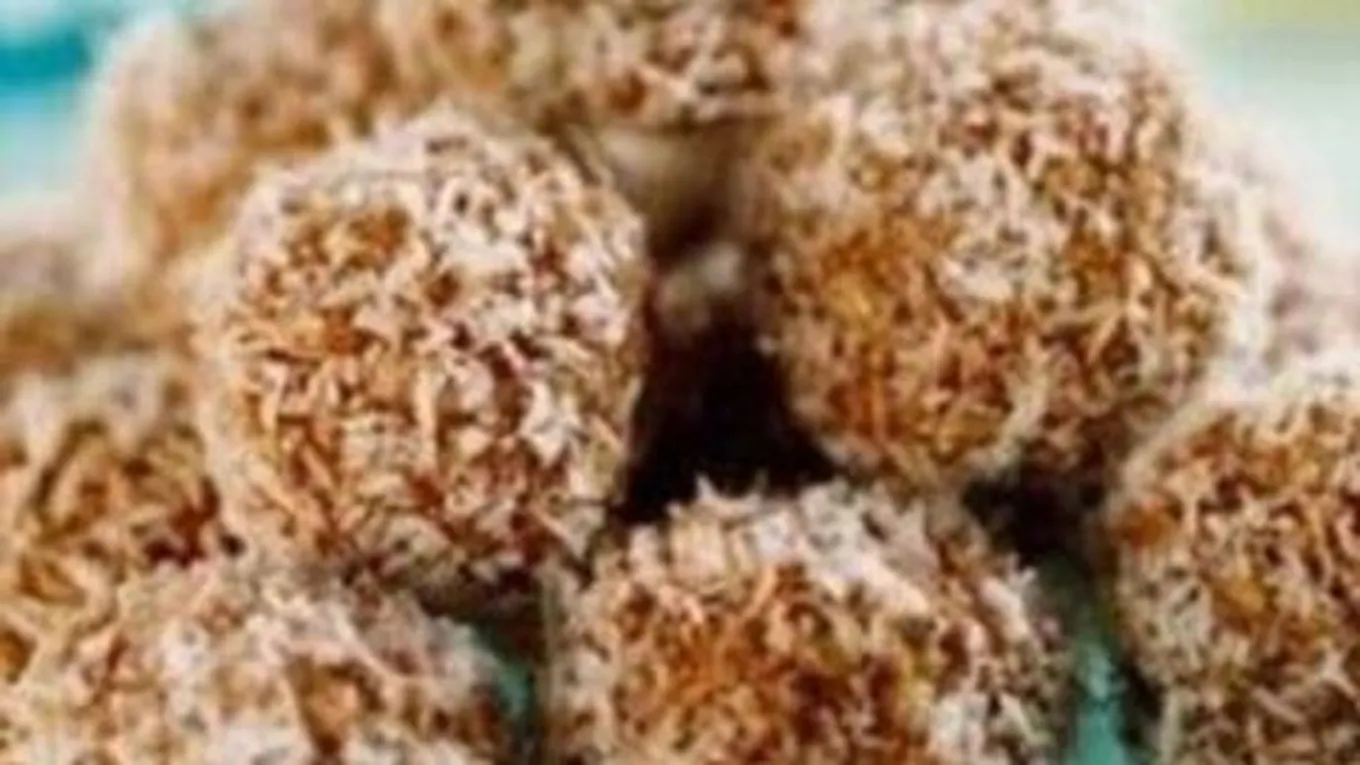 - نصنع كرات صغيرة من المزيج ونغطي نصف الكمية بجوز الهند.