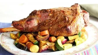 - نُقدم فخذ الغنم المحمر مع الخضار مباشرة.