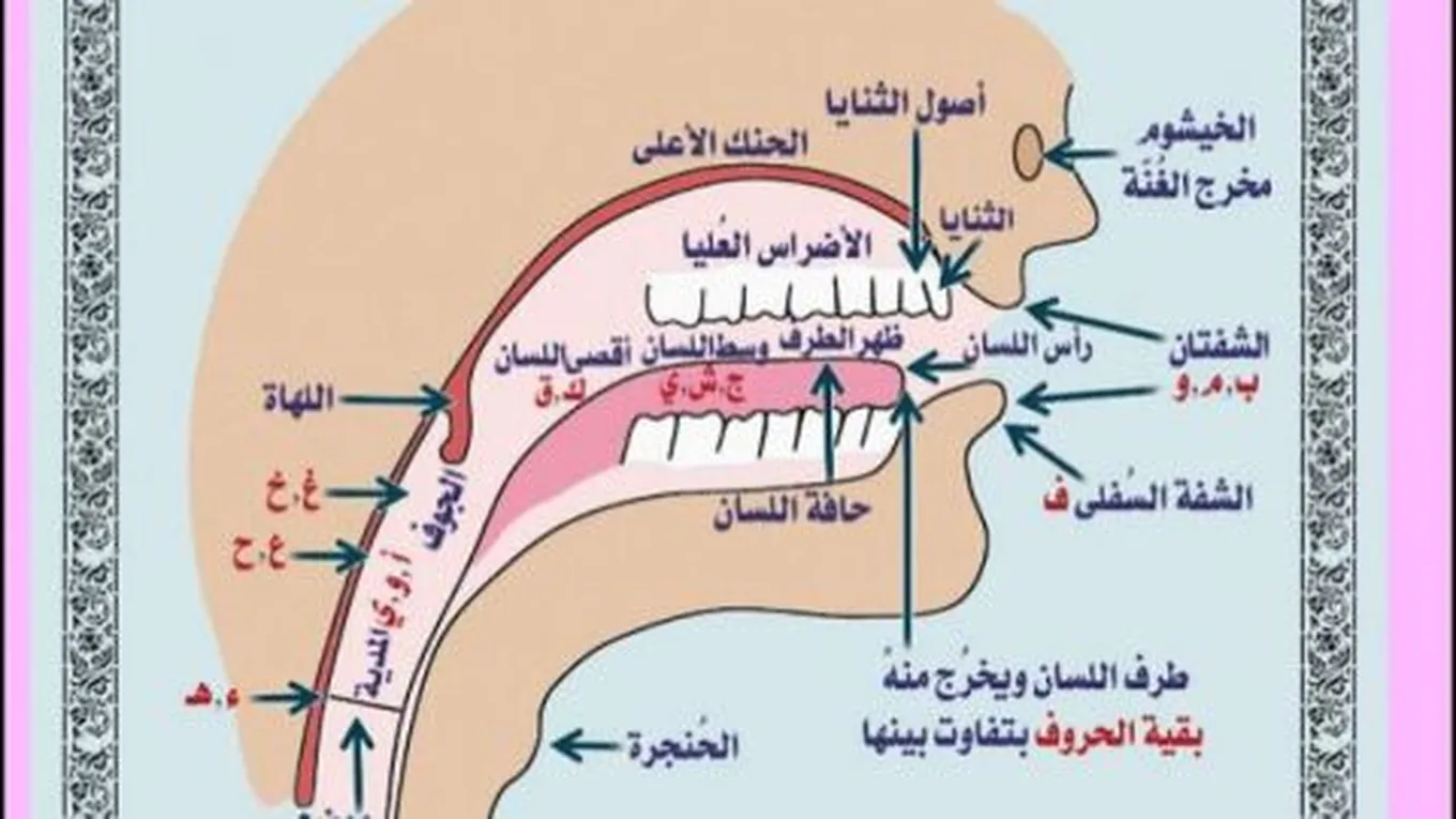 - أقصى الحلق: أبعد نقطة فيه وأكثرها غوراً، ويخرج منه حرفا الهمزة والهاء.