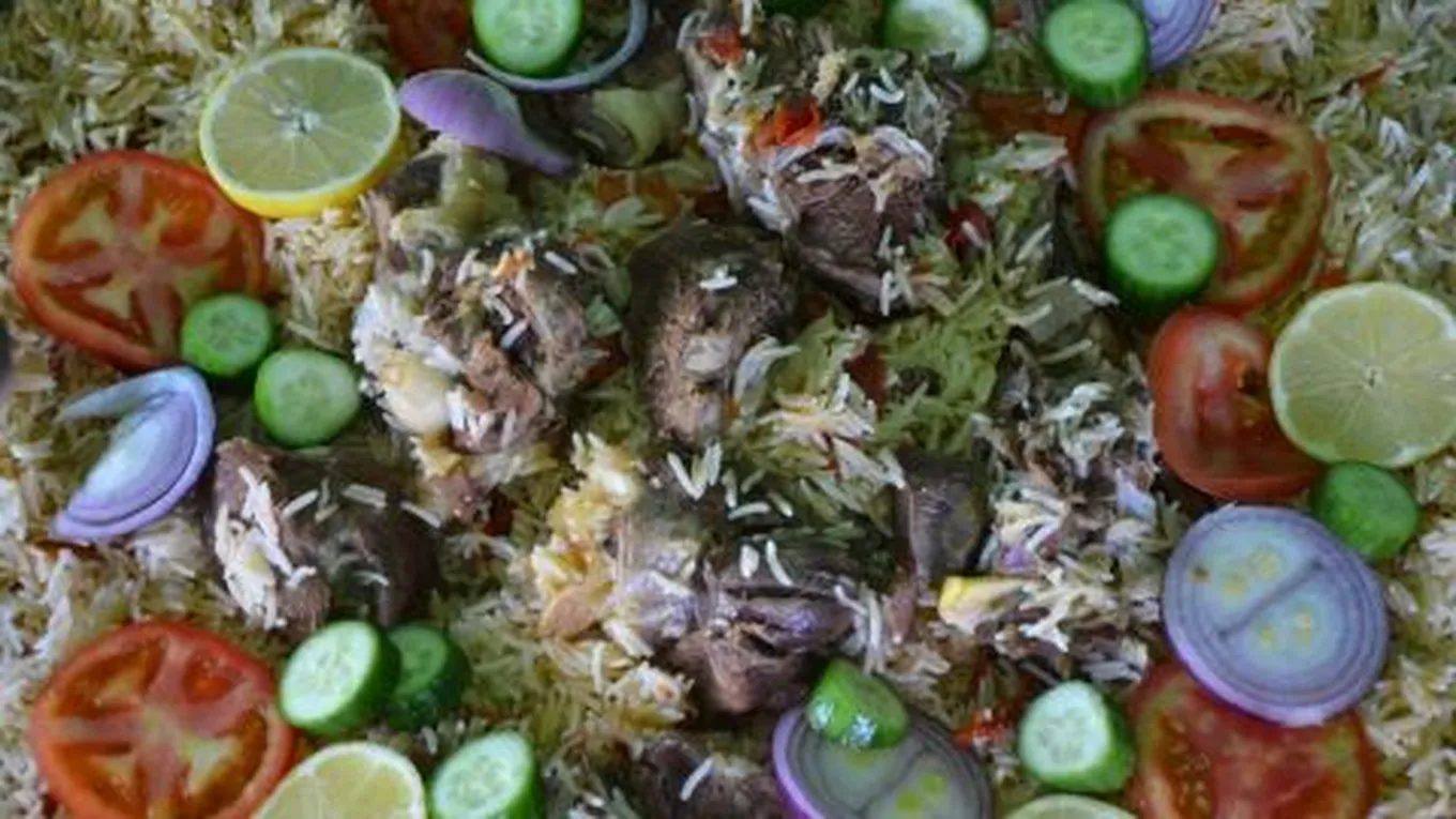 - توزيع اللحم والخضروات ثمَّ توزيع الكشنة على الكبسة، وتقديمها.