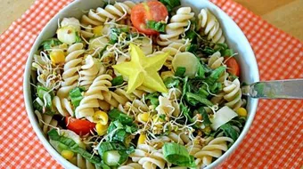 سلطة المعكرونة بالذرة مدة التحضير 20 دقيقة مدة الطهي 10 دقائق تكفي لـ 4 أشخاصالمكوناتمئتا غرامٍ من المعكرونة. كوب من كلٍ من:ربع كوب من جبن البرميزان المبروش.