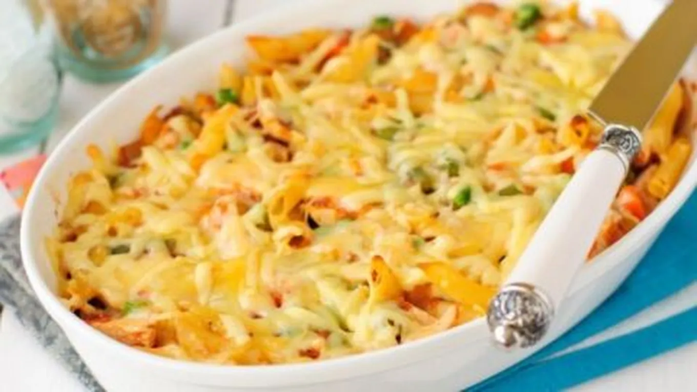 - وضع المعكرونة في صينيّة مخصّصة للفرن، ثم إضافة خليط الدجاج إليها.