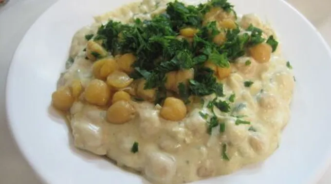 - سكب مسبحة الحمص في طبق تقديم عميق.