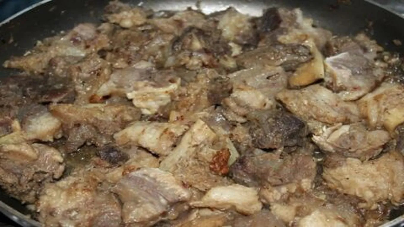 - ننشل قطع اللحم من الزيت ونضع الثوم المهروس، والبصل المفروم ناعماً، ونقلبهما جيداً حتى تذبل وتأخذ نكهة البهارات.