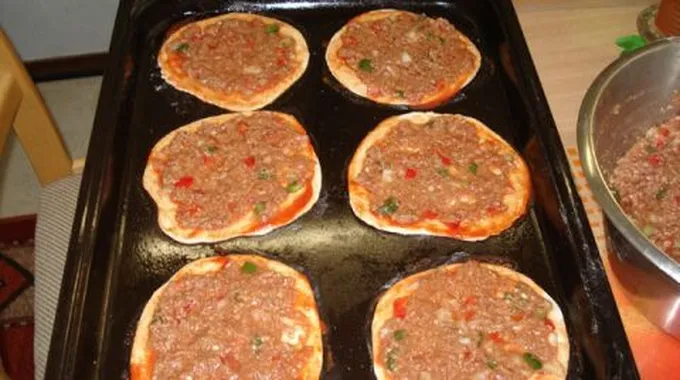 - نقطع العجينة بواسطة قطاعة مستديرة بالحجم المرغوب، نضع حشوة اللحم في منتصف كل دائرة ومن ثم بباطن اليد نفرد اللحم على العجين حتى تتغطى العجينة كلها بحشوة اللحم.