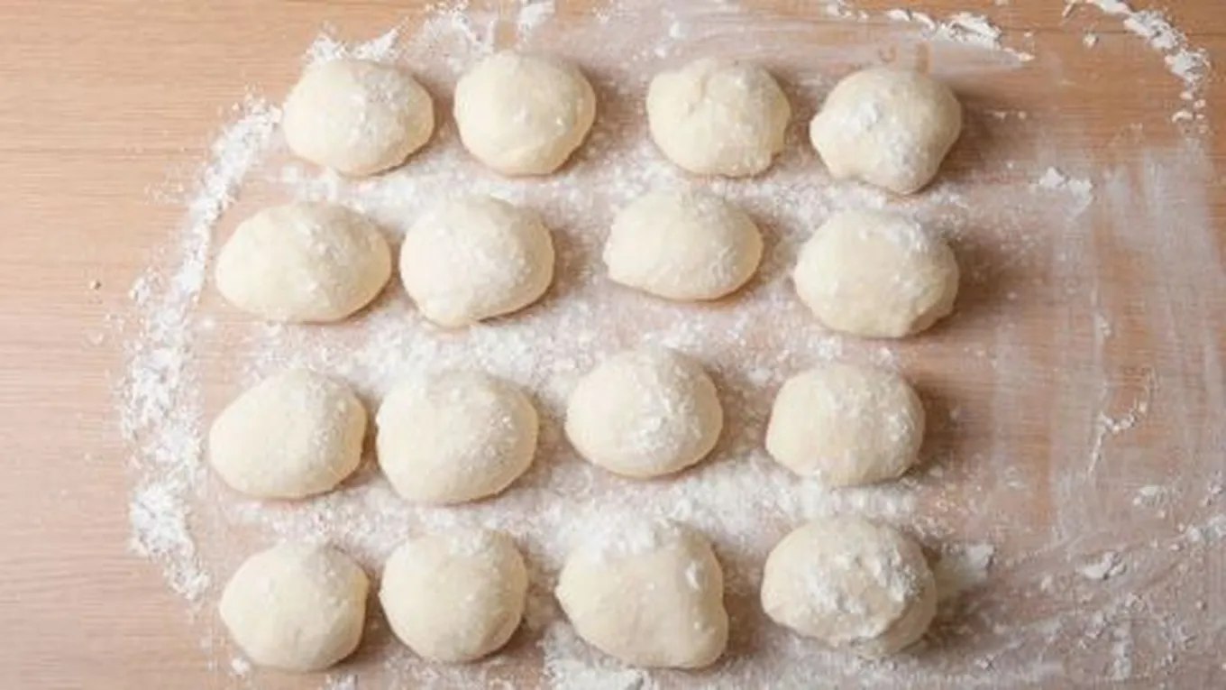 - نعجن الطحين الأبيض، والخميرة الفورية، والبيكنج باودر، والزيت النباتي، والملح، والسكر، واللبن الرائب بشكلٍ جيد، حتى تتشكل لدينا عجينة متجانسة وطرية.