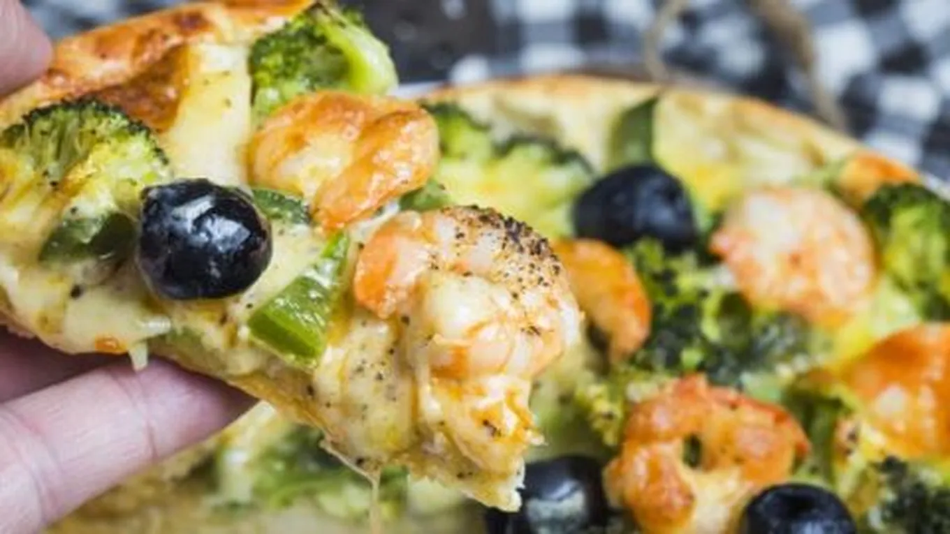 بيتزا الروبيان مدّة التحضير 10 دقائق تكفي لِـ 4-5 أشخاصالمكوّنات خمسمئة غرام من الروبيان. كوبان وثلاثة أرباع الكوب من الدقيق. ملعقة كبيرة من الخميرة الفورية