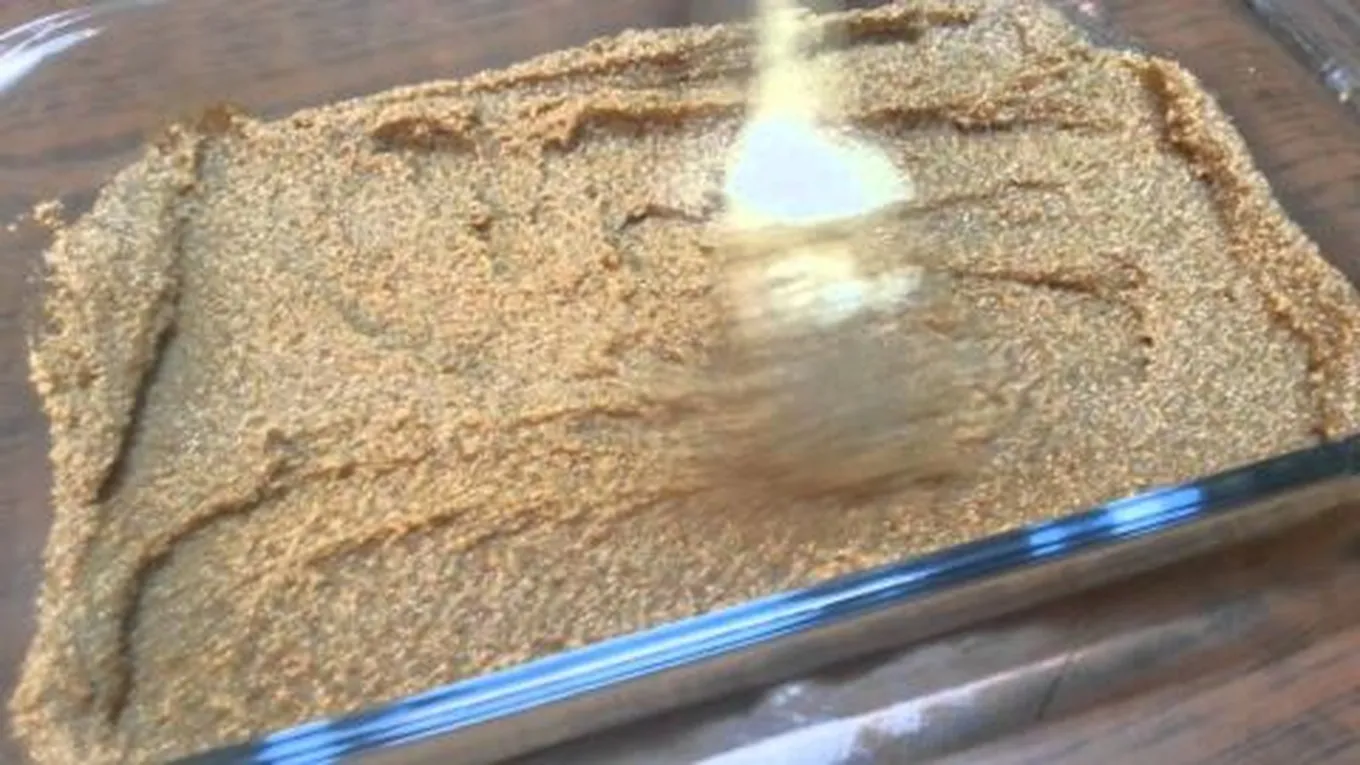 - اخلط الزبدة السائلة مع البسكويت وضعه في صينية الكيك.
