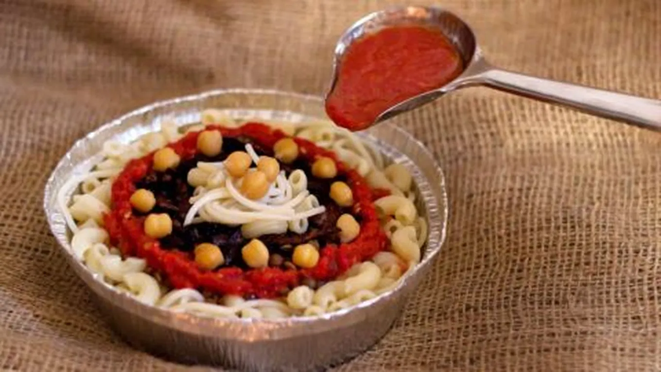 - وضع الكشريّ في طبق تقديم دائريّ، وتوزيع المعكرونة فوقه، ثم توزيع البصل المقليّ عليه، وتقديم صلصة البندورة إلى جانبه.