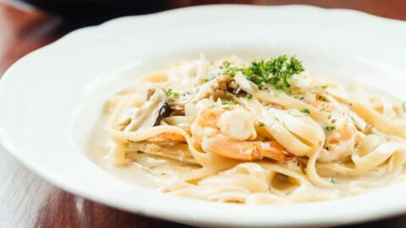 - تصفية المعكرونة وإضافتها على الرّوبيان والتّقليب إلى أن تختلط المواد ثمّ سكبها للتقديم ونثر البقدونس وتقديمها مباشرة.