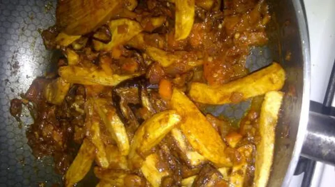 - أضيفي مكعبات الباذنجان، والبندورة إلى الخليط، واتركيه على نار هادئة حتى تجف السوائل.
