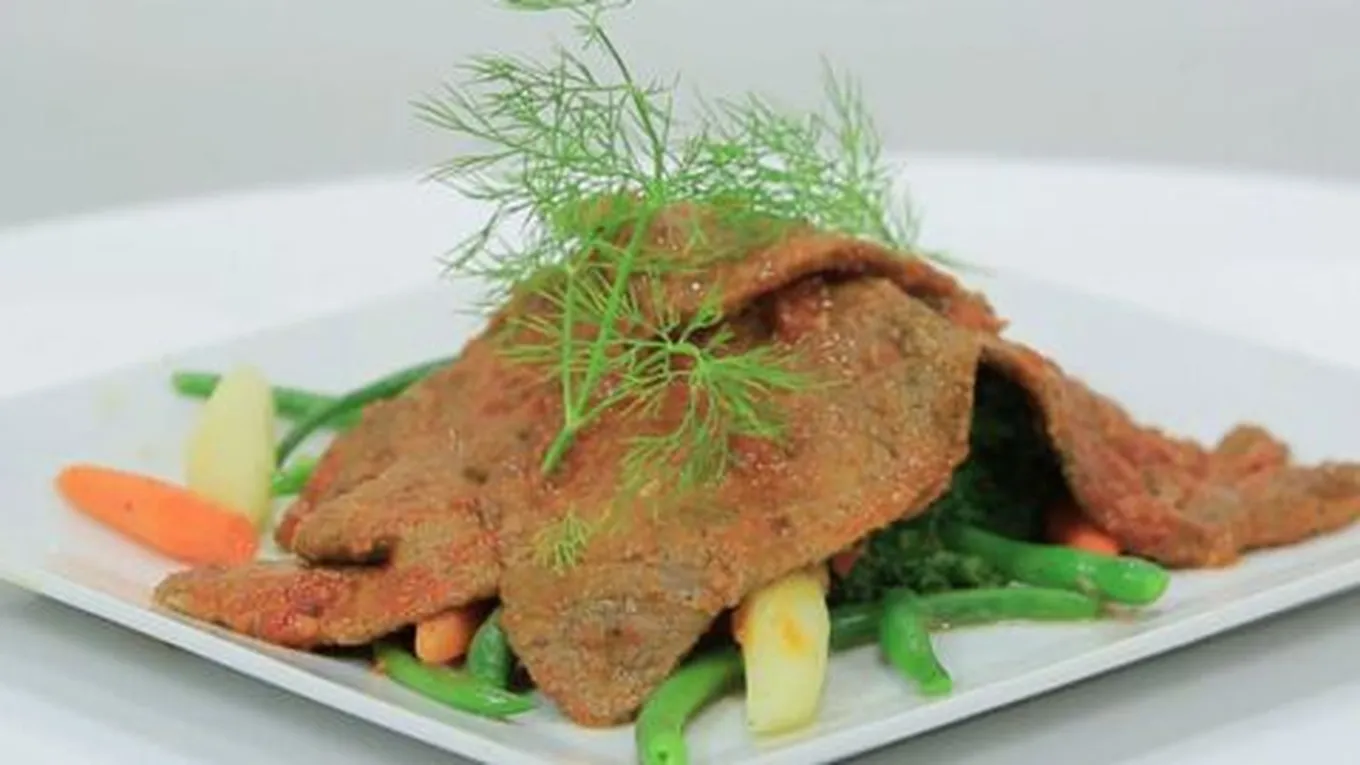 - وضع شرائح البفتيك في طبق التقديم، وإضافة خليط الخضار إلى جانبها.