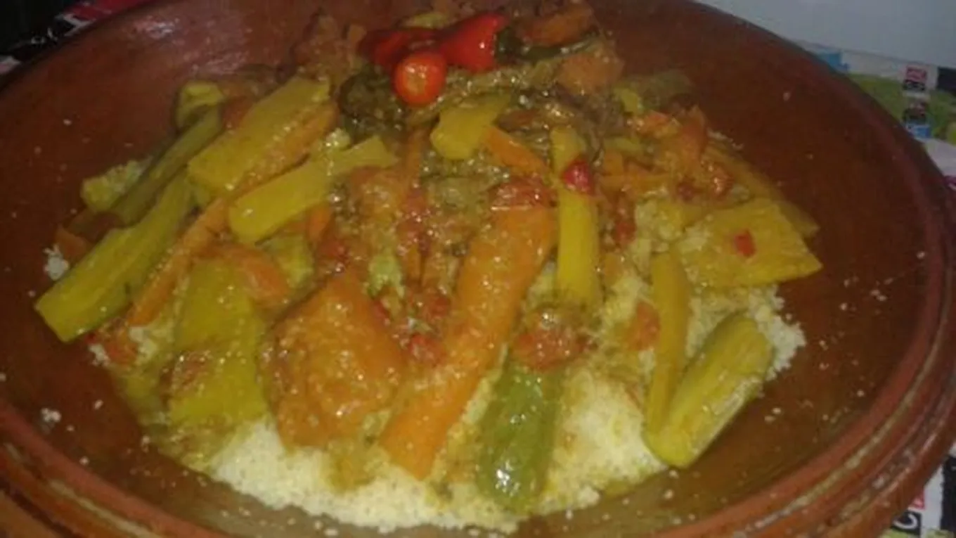 - وضع الكسكس بطبق تقديم مناسب وسكب بعض من خليط الخضار فوقه للتزيين ثمّ تقديمه بجانب الخضار ساخناً.