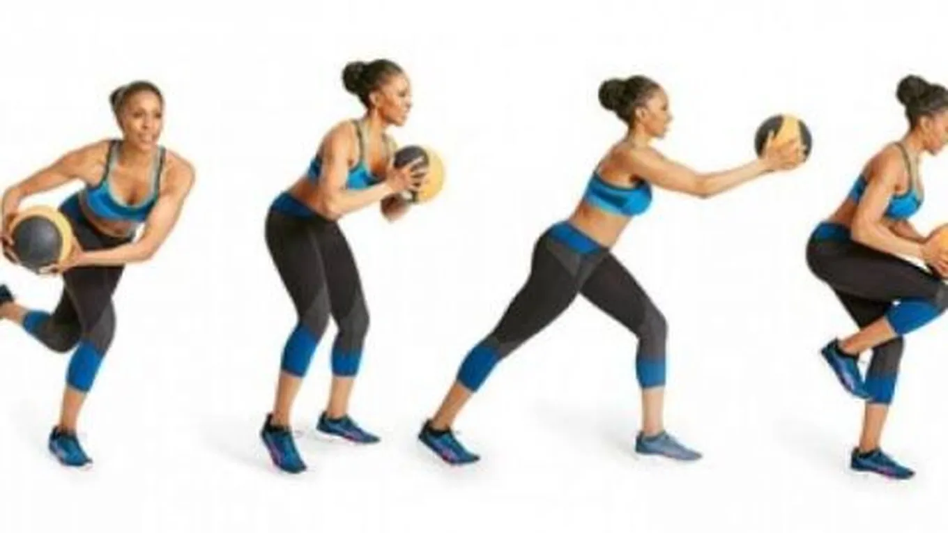 - تمرين الحركة بالكرة الطبية: نقف بشكل ثابت أولاً، ونُمسك الكرة الطبية بكلتا يدينا ونضعها أمام منطقة الصدر، ثم نرفع الكرة الطبية لأعلى باستعمال الذّراعين وباتجاه الذراع الأيمن، ونُميل جانب الجسم إلى الجهة اليمنى، ثم نرفع الساق اليسرى قليلاً عن الأرض، ونتّكئ على القدم، بعدها نعود بشكل تدريجي إلى الجانب الآخر مع مراعاة حمل الكرة بين اليدين، ونُكرّر هذه الخطوات 15 مرّة.