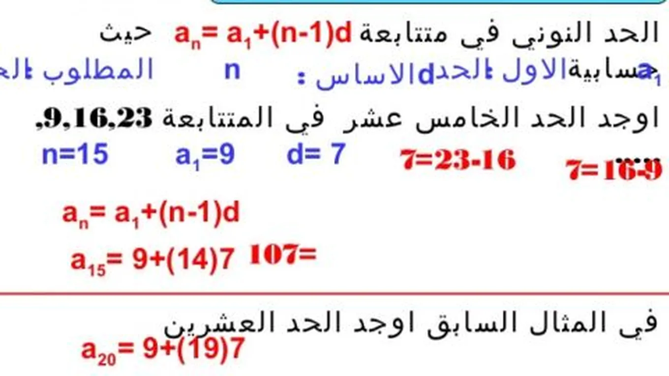 - مثال: أوجد الحد الثالث عشر للمتتابعة الحسابيّة {1، -3، -7، -11،....}.