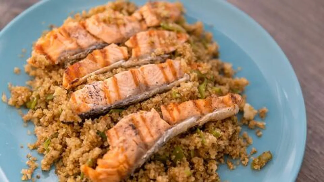 - سكب باقي كمية الصلصة فوق الكسكسي ووضع السمك والفلفل الحار على الوجه وتقديم طبق الكسكسي ساخناً مع وسلطة خضراء.