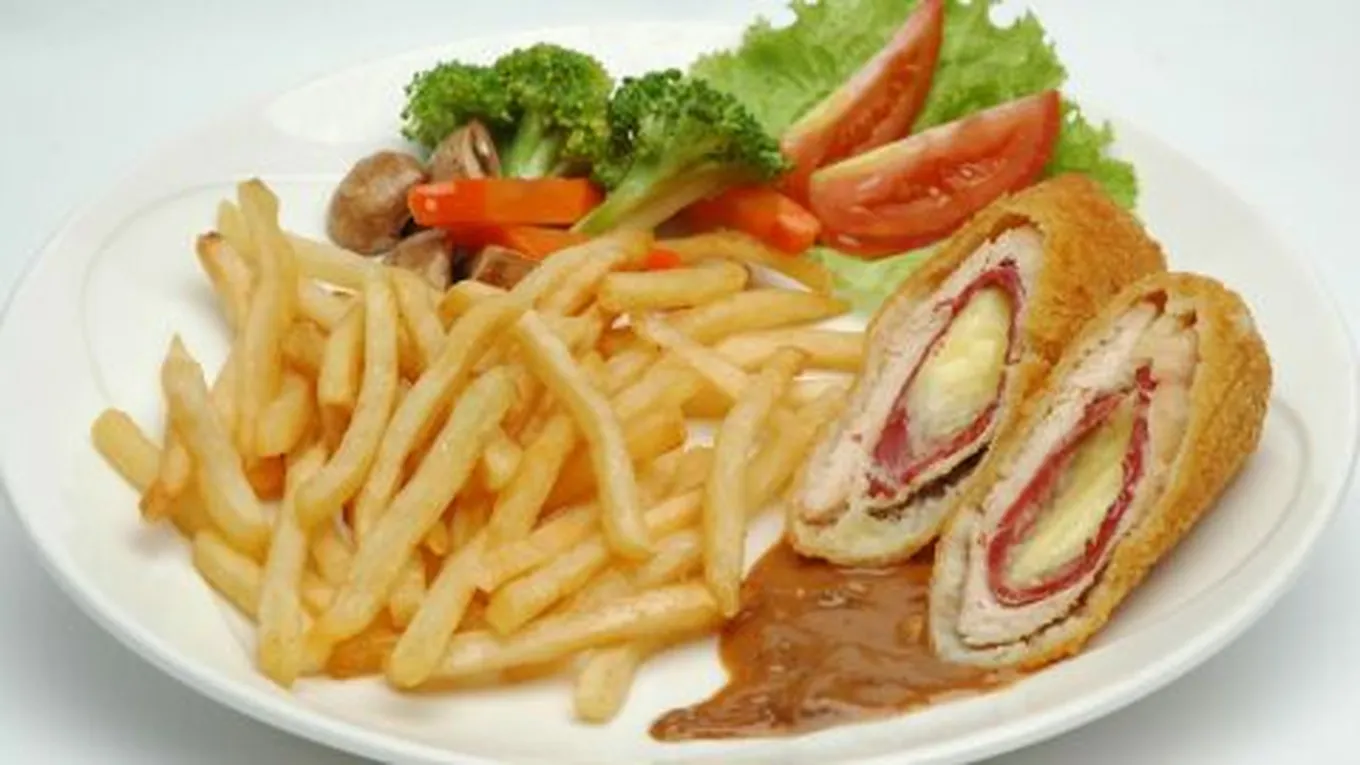 - وضع قطعة من اللانشون، وشريحة من الجبن ثمّ بعض الزّيتون على نصف الفيليه المدقوقة، وثني النّصف الثّاني للفيليه للحصول على نصف دائرة مع المحاولة لإدخال اللانشون والجبن إلى داخل الفيليه ثمّ تثبيت الأطراف بأعواد خشبيّة صغيرة.