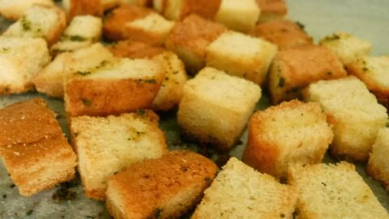 - نقطّعُ الخبز إلى مربعات صغيرة، ثمّ نقليها في الزيت النباتي المحمي، ونتركه حتّى يصبحَ لونه مائلاً إلى الذهبيّ.