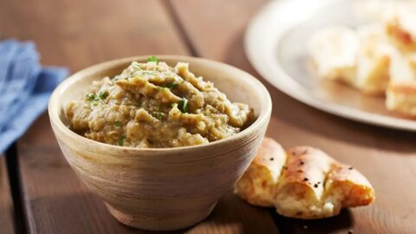 - قشّري الباذنجان واهرسيه بواسطة الشوكة في صحن الخلط.