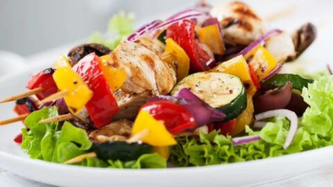 أسياخ الدجاج مع الخضار مدَّة التَّحضير خمس عشرة دقيقة مدَّة الطَّهي خمس عشرة دقيقة تكفي لـِ أربعة أشخاصالمكوّناتقطعتان من أنصاف صدر الدّجاج المسحّب والمنزوع