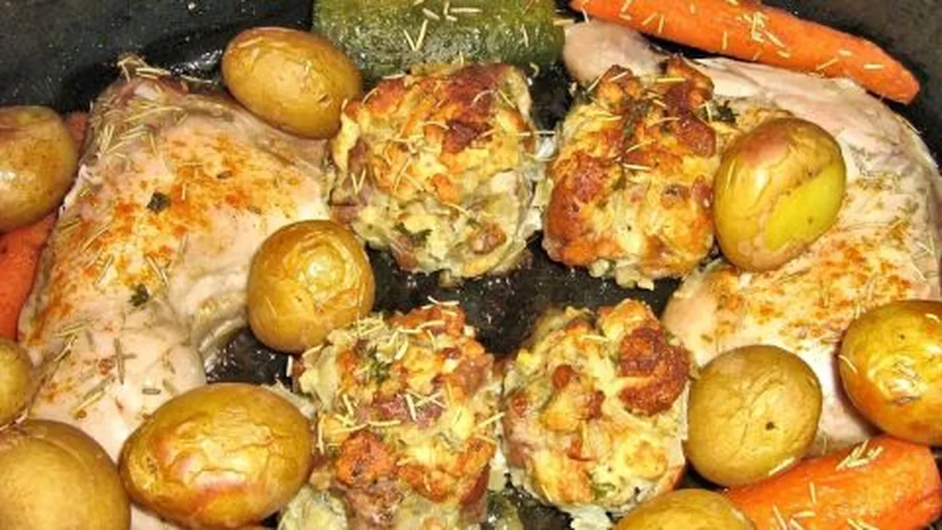 - وضع الدجاج وكل خليط الصلصة فوق الخضروات بحيث يكون الجلد إلى أعلى .