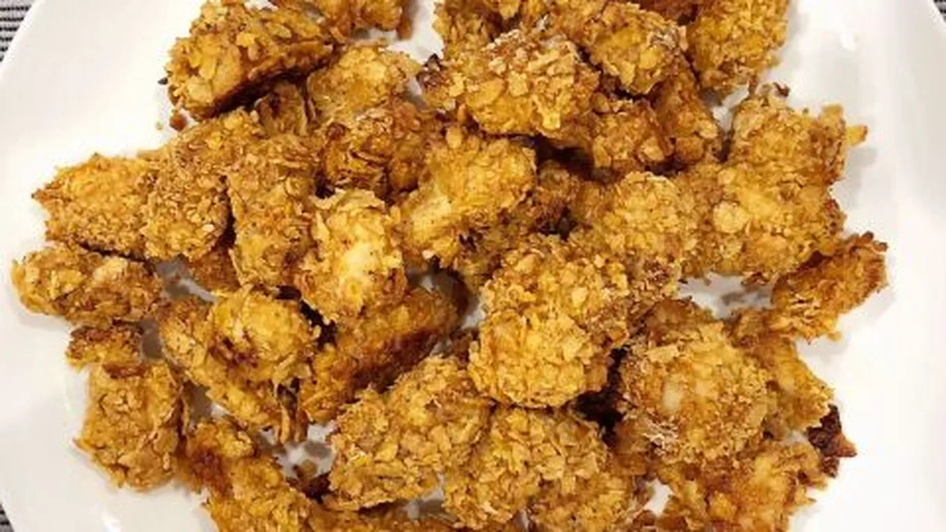 - تغليف قِطع الدَّجاج بالقرشلة المخلوطة مع الشوفان.