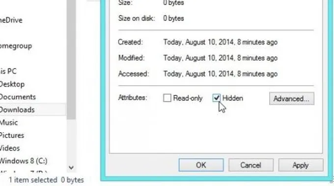 - عندما تظهر نافذة فيها كلمة إخفاء (بالإنجليزيّة: Hidden)، يجب الضّغط على المربّع، وبذلك يتفعّل إخفاء الملفّ.