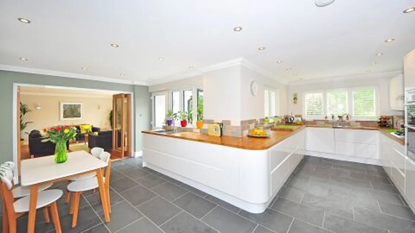 - الغرفة الكبيرة: يمكن للمطبخ ذو المساحة الكبيرة والمفتوح على غرفة الجلوس أن يوفر مساحة جيدة للتزيين، إذ يمكن وضع طاولة طعام كبيرة تتسع لعدد كبير من الأشخاص للقاءات العشاء، وحتى العمل على المشاريع العلمية، ويمكن كذلك إضافة سجادة باللونين الأبيض والأسود لإضفاء مظهر عصري على المطبخ.