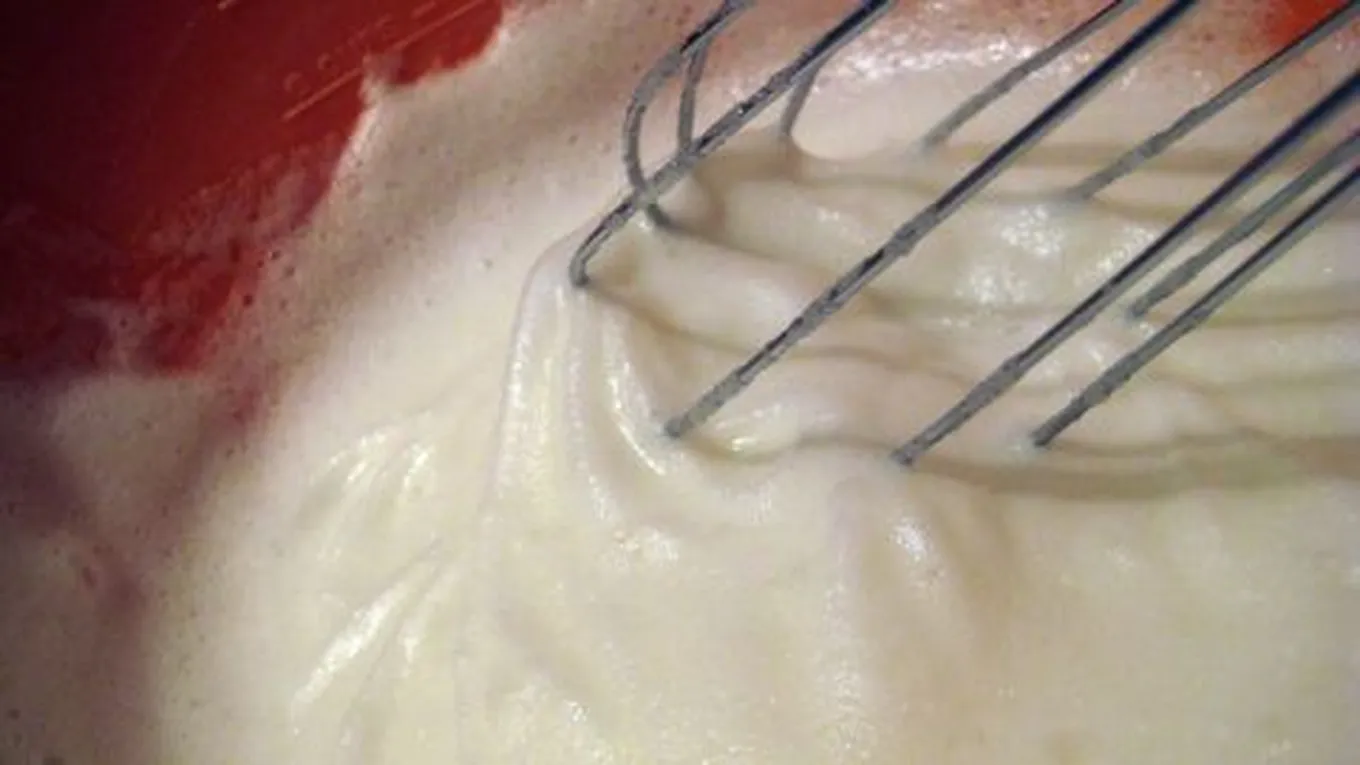 - نسكب الحليب فوقها ونستمر في الخفق حتى نحصل على كريمة متماسكة.