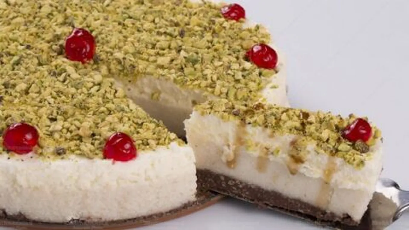 - بعد أن يبرد الخليط ويصبح متماسكاً، نسكب القشطة عليه، ثم نرتب سطحها بملعقة مستوية، ثم نرش فوقها اللوز والفستق الحلبي والصنوبر.