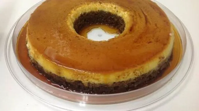 - نسكب الكريم كراميل بهدوء فوق خليط الكيك.
