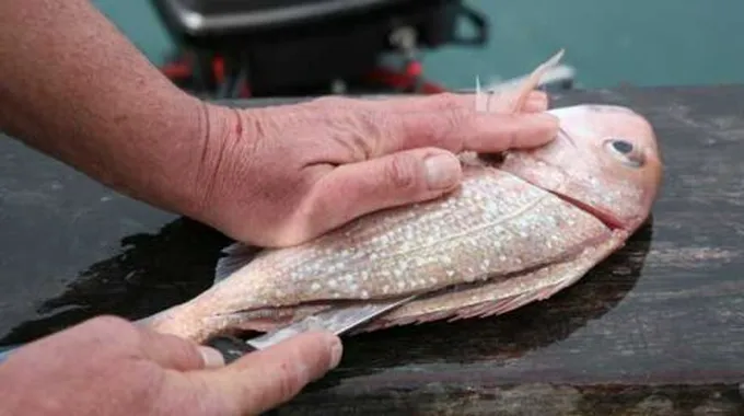 - نمسك رأس السمكة ثمّ نشق ظهرها بسكين حاد بحيث نمسك جلدة السمكة باستخدام الزراديّة من مكان الشقّ، ونسحب الجلدة باتّجاه الذّنب.