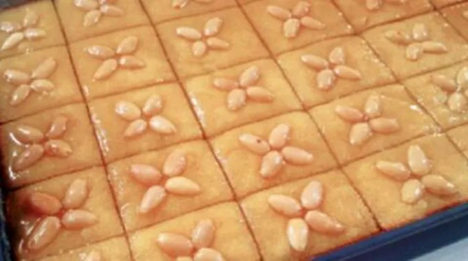 - تزيين الهريسة من الأعلى باللوز بعدَ أن تنضُج من الأسفل، ثُمَّ إعادتها إلى الفُرن حتّى تتحمَّر من الأعلى.