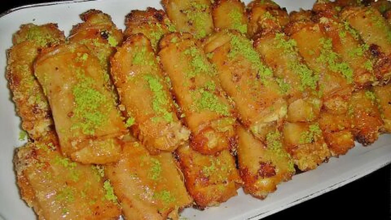 - ضعي زنود الست في طبق التقديم وزينيها بالفستق المطحون.