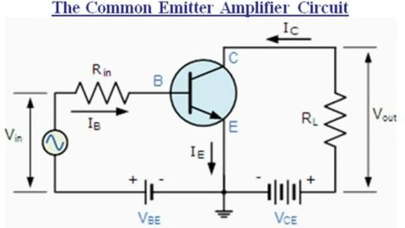 الترانزستور له ثلاثة أطراف هي القاعدة B والمجمع C والباعث E.