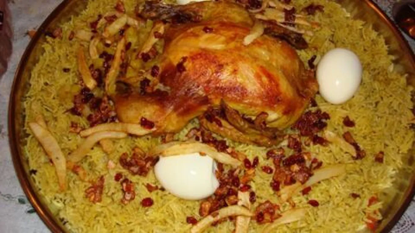 - نضع الدجاج فوق السمنة، ونضع الأرز المسلوق ثمّ نرشّ الزعفران المنقوع مع ماء الورد، وأخيراً نوزّع الحمّص والزبيب على الوجه.