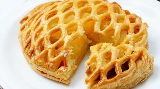 - إدخال الفطيرة إلى الفرن لمدة (20-25) دقيقة، حتى تنضج الفطيرة، وتكتسب اللون الذهبي، وتركها تبرد قليلاً.
