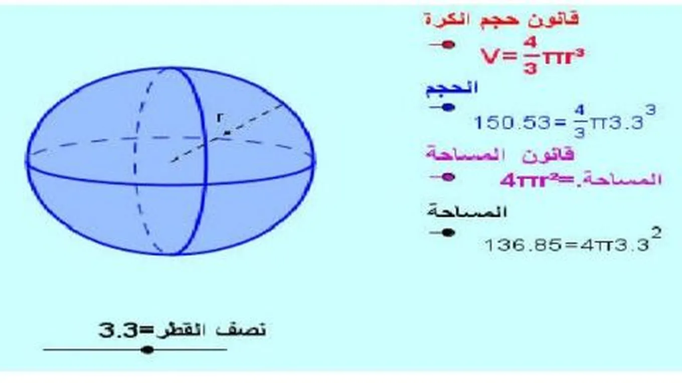 - مثال4:مجسم كروي الشكل، إذا علمت أنّ حجمه يساويπ400سم³، احسب طول نصف قطره.[1]